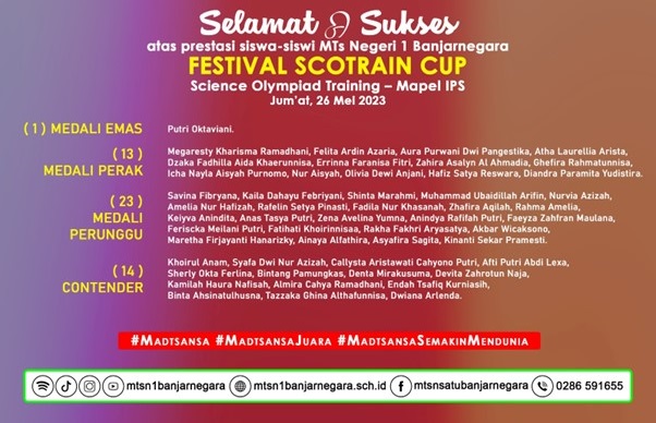 Perjuangan itupun ditunjukkan oleh siswa siswi bimbingan prestasi mata pelajaran IPS yang sukses merebut 51 medali di ajang Festival Scotrain Cup, sebuah kompetisi online yang diselenggarakan oleh Science Olympiad Training pada akhir pekan lalu.