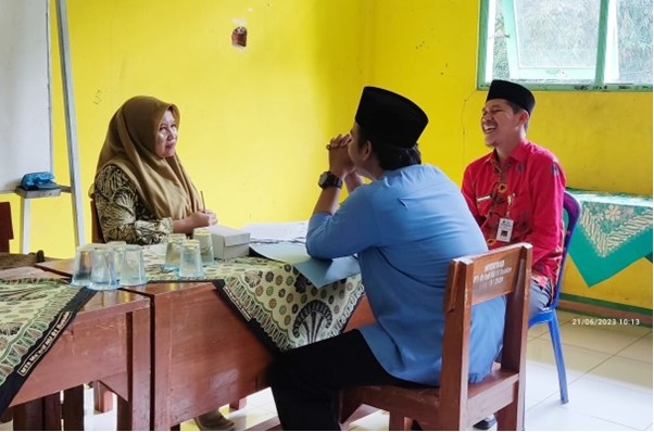 Kepala MTs Ma’arif NU 01 Susukan, M. Nur Imam Fathoni didampingi Operator Madrasah PIP, Muhammad Isro memberikan dan menyediakan data serta laporan yang berkaitan dengan pelaksanaan PIP untuk dilaporkan kepada tim monitoring yang di pimpin langsung oleh Rodlatul Jannah dari Kemenag Kabupaten Banjarnegara.