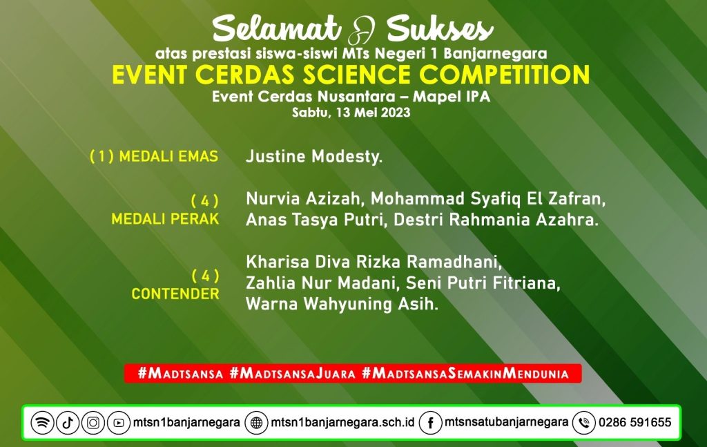 Diumumkan oleh guru pembimbing siswa berprestasi mata pelajaran IPA pada Sabtu (13/5) Justine Modesty kembali meraih medali emas dari ajang mape online Event Cerdas Science Competition yang diselenggarakan oleh Event Cerdas Nusantara.